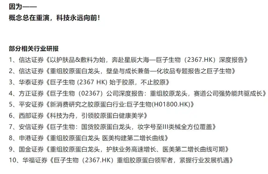 在这篇文章中,华熙生物不留情面,一口气“点名”了十家券商的研报,比如华泰证券发布的《巨子生物 (2367 HK) 始于胶原,不止胶原》;国金证券发布的《重组胶原蛋白龙头,护肤业务高速增长、医美第二增长曲线可期》;西部证券发布的《科技为舟,引领胶原蛋白健康美学》。