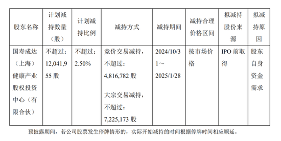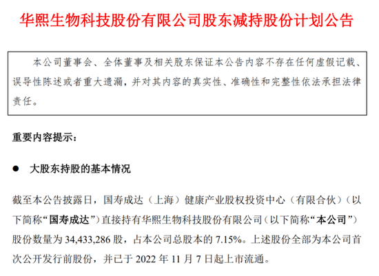 华熙生物去年10月公告,国寿成达因“自身资金需求”,计划通过集中竞价和大宗交易的方式减持不超过1204.2万股,约占公司总股本的2.5%。减持股份来源均为IPO前获得。以当时华熙生物收盘价80.45元(10月8日)计算,减持可套现金额接近9亿元!