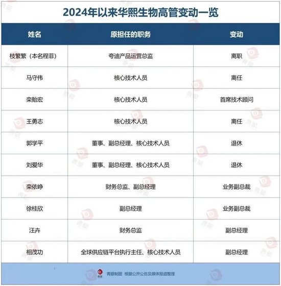 股价暴跌、业绩塌方和战略失效之外,华熙生物的内部管理似乎也出了问题。近年华熙生物的管理层频繁变动,仅2024年公告的就有十位高管职位相继发生变动,其中半数为公司核心技术人员。