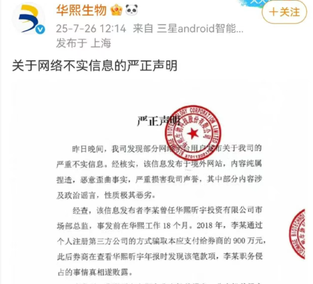 随后,华熙生物火速在官方微博发布《关于网络不实信息的严正声明》 ,称经核实,信息发布于境外网站,内容纯属捏造,恶意歪曲事实,其中部分谣言性质极其恶劣。
