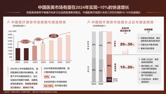 而从行业角度看,医美赛道整体仍处于成长期。中国整形美容协会数据显示,2024 年医美行业增速10%,达2400亿元,未来四年年复合增速10 - 15%,发展动利仍算较强。
