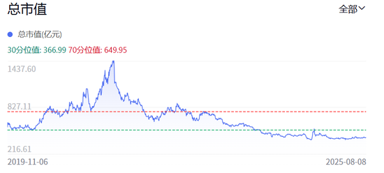 但高潮之后是落寞,之后华熙生物股价开启了长达四年的持续下跌通道,截至8月8日收盘,已经从312.99元(前复权价)的高位跌去约82%,市值蒸发超千亿;今年4月股价最低时,华熙生物跌幅甚至达到了86.5%,跌破了IPO发行价。