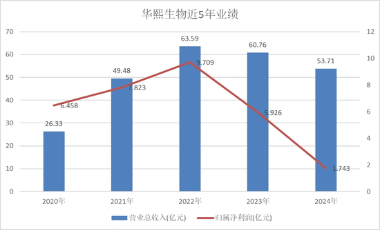 但没想到的是,2024年华熙生物交出了“更差”的成绩单——营业收入53.71亿元,同比下降11.61%;归母净利润1.74亿元,同比下降70.59%;扣非净利润1.07亿元,同比下降78.13%!