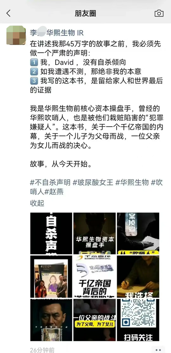 该人士称,自己曾是华熙生物核心资本操盘手、吹哨人,也是被栽赃陷害的“犯罪嫌疑人”,这本书(揭示了)一个千亿帝国的内幕,(是)一个儿子为父母而战、一位父亲为女儿而战的决心。该人士称自己如遭遇不测,绝非自己本意,写这本书是留给家人和世界最后的证据。